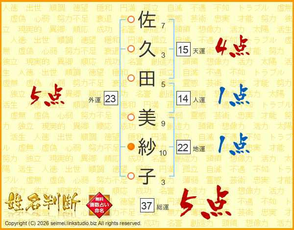 佐(7画)久(3画)田(5画) 美(9画)紗(10画)子(3画)