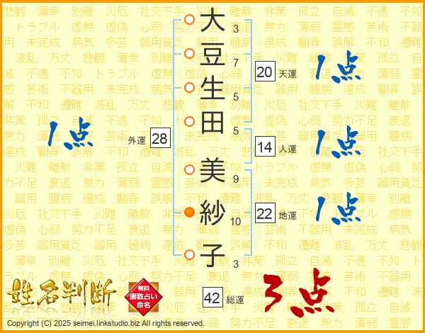 大(3画)豆(7画)生(5画)田(5画) 美(9画)紗(10画)子(3画)