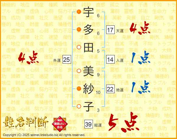 宇多田美紗子さんの総運は39画の5点!