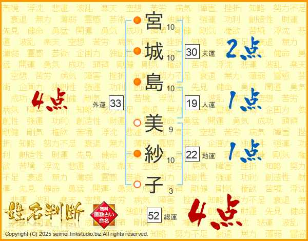 宮(10画)城(10画)島(10画) 美(9画)紗(10画)子(3画)