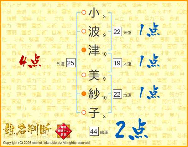 小(3画)波(9画)津(10画) 美(9画)紗(10画)子(3画)