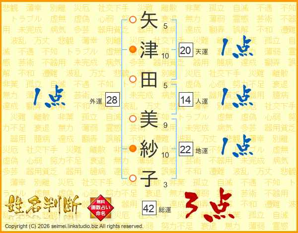 矢(5画)津(10画)田(5画) 美(9画)紗(10画)子(3画)