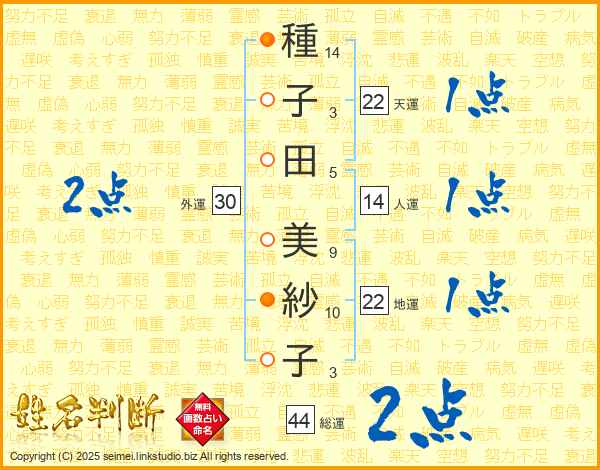種(14画)子(3画)田(5画) 美(9画)紗(10画)子(3画)