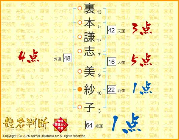 裏(13画)本(5画)謙(17画)志(7画) 美(9画)紗(10画)子(3画)