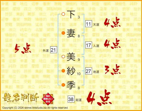 下(3画)妻(8画) 美(9画)紗(10画)季(8画)