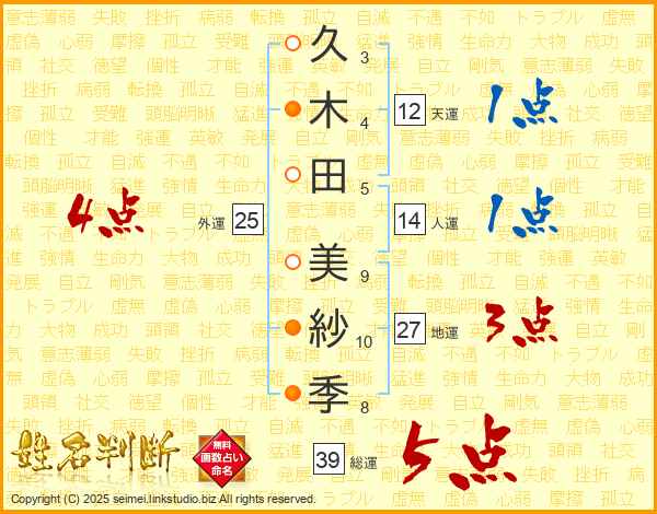 久(3画)木(4画)田(5画) 美(9画)紗(10画)季(8画)