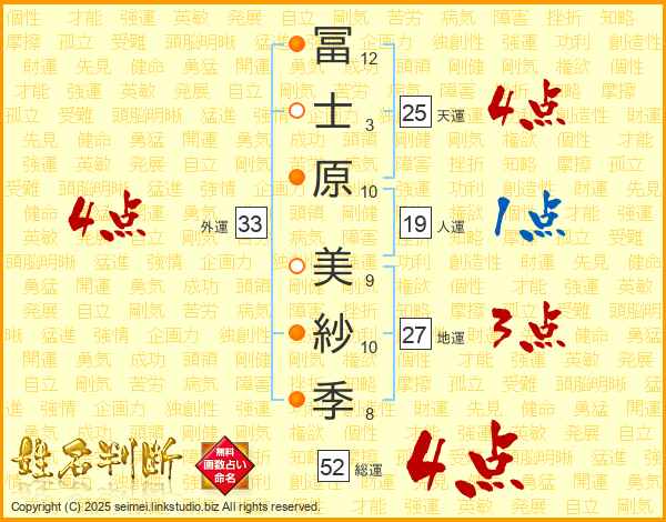 冨(12画)士(3画)原(10画) 美(9画)紗(10画)季(8画)