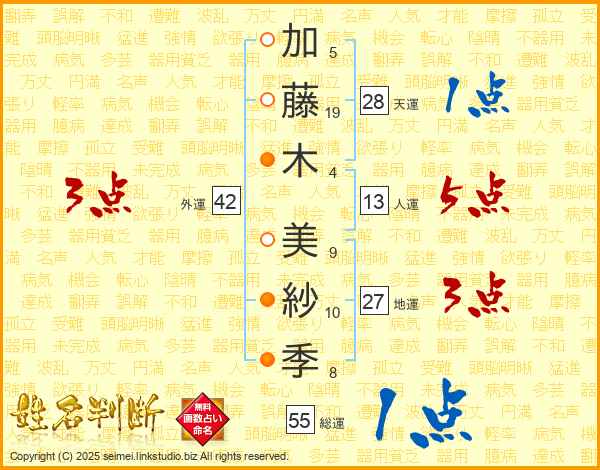 加(5画)藤(19画)木(4画) 美(9画)紗(10画)季(8画)