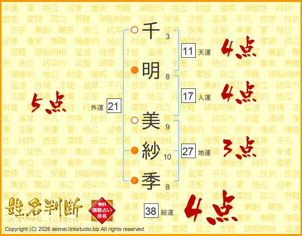 千(3画)明(8画) 美(9画)紗(10画)季(8画)