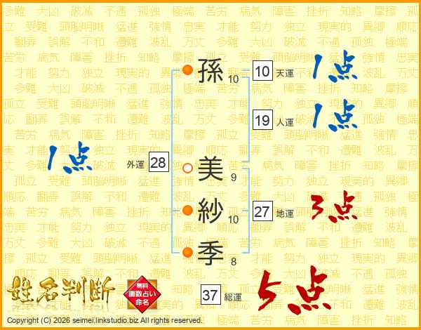 孫(10画) 美(9画)紗(10画)季(8画)