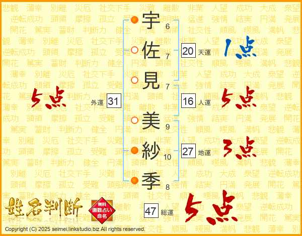 宇(6画)佐(7画)見(7画) 美(9画)紗(10画)季(8画)
