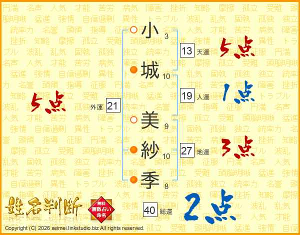 小(3画)城(10画) 美(9画)紗(10画)季(8画)