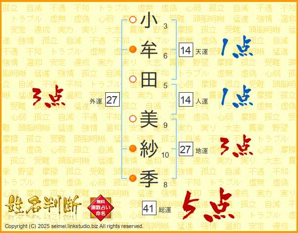 小(3画)牟(6画)田(5画) 美(9画)紗(10画)季(8画)