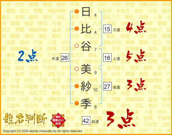 日(4画)比(4画)谷(7画) 美(9画)紗(10画)季(8画)