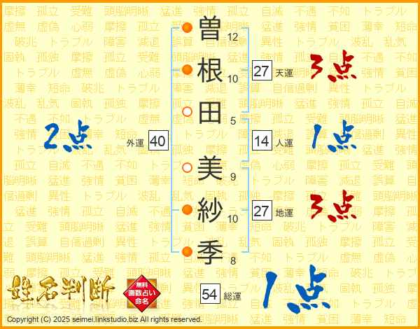 曽(12画)根(10画)田(5画) 美(9画)紗(10画)季(8画)