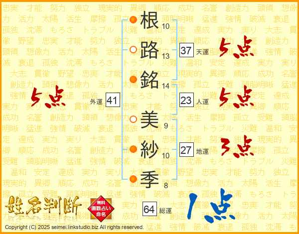 根(10画)路(13画)銘(14画) 美(9画)紗(10画)季(8画)