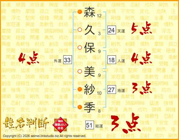 森(12画)久(3画)保(9画) 美(9画)紗(10画)季(8画)