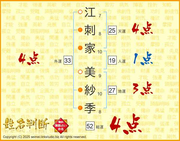 江(7画)刺(8画)家(10画) 美(9画)紗(10画)季(8画)