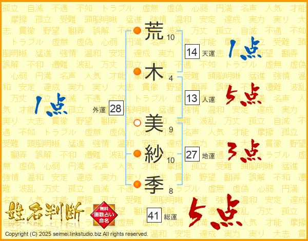 荒(10画)木(4画) 美(9画)紗(10画)季(8画)