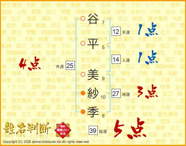 谷(7画)平(5画) 美(9画)紗(10画)季(8画)