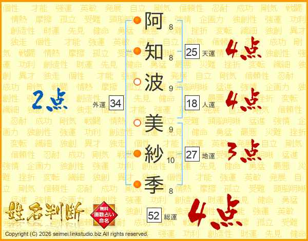 阿(8画)知(8画)波(9画) 美(9画)紗(10画)季(8画)
