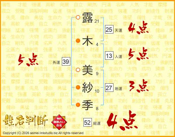 露(21画)木(4画) 美(9画)紗(10画)季(8画)