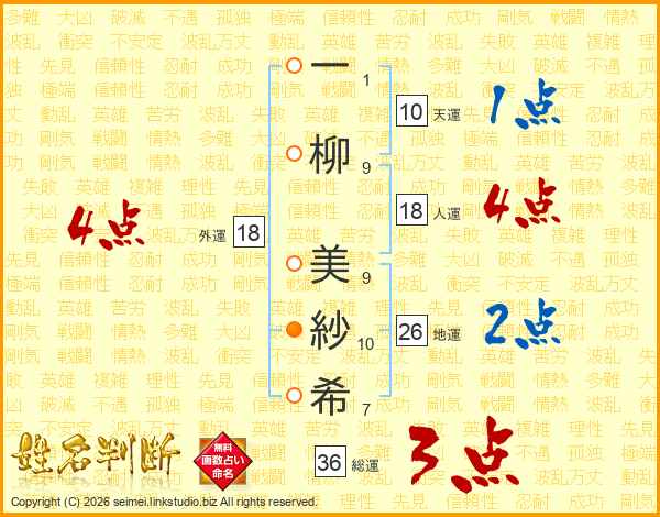 一柳美紗希さんの地運は26画の2点!