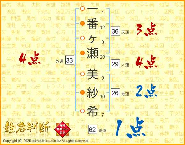 一番ヶ瀬美紗希さんの外運は33画の4点!