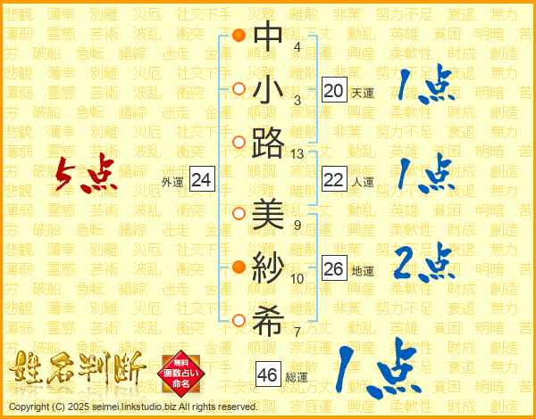 中(4画)小(3画)路(13画) 美(9画)紗(10画)希(7画)