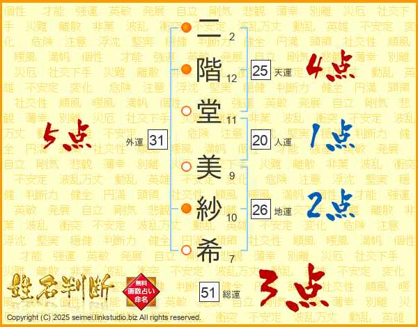 二(2画)階(12画)堂(11画) 美(9画)紗(10画)希(7画)