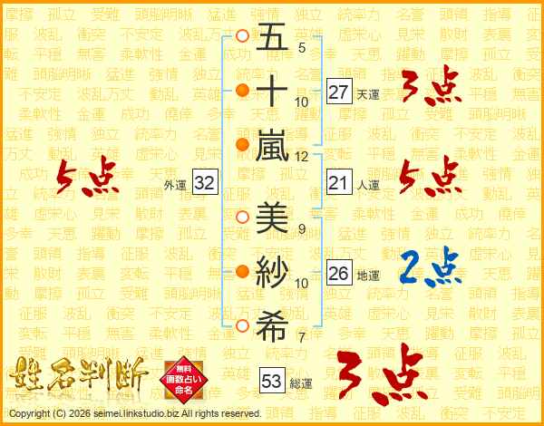 五(5画)十(10画)嵐(12画) 美(9画)紗(10画)希(7画)