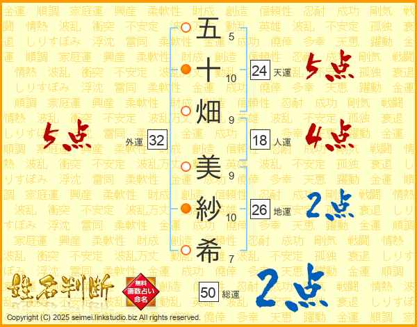五(5画)十(10画)畑(9画) 美(9画)紗(10画)希(7画)