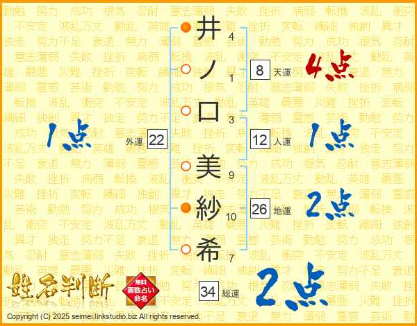 井(4画)ノ(1画)口(3画) 美(9画)紗(10画)希(7画)