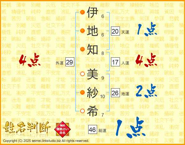 伊(6画)地(6画)知(8画) 美(9画)紗(10画)希(7画)
