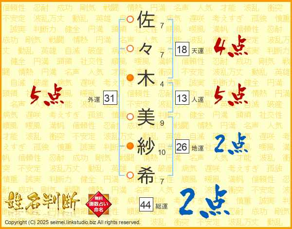 佐(7画)々(7画)木(4画) 美(9画)紗(10画)希(7画)