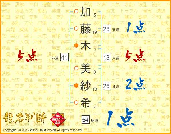 加(5画)藤(19画)木(4画) 美(9画)紗(10画)希(7画)