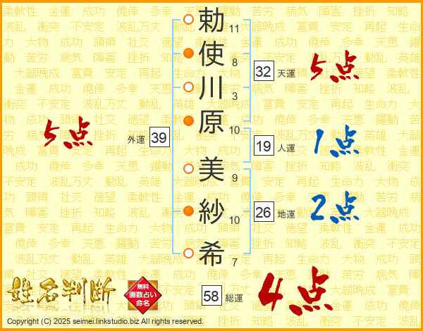 勅(11画)使(8画)川(3画)原(10画) 美(9画)紗(10画)希(7画)