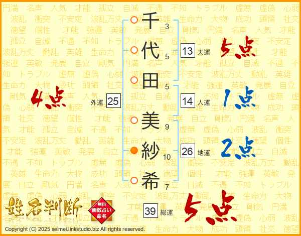 千(3画)代(5画)田(5画) 美(9画)紗(10画)希(7画)