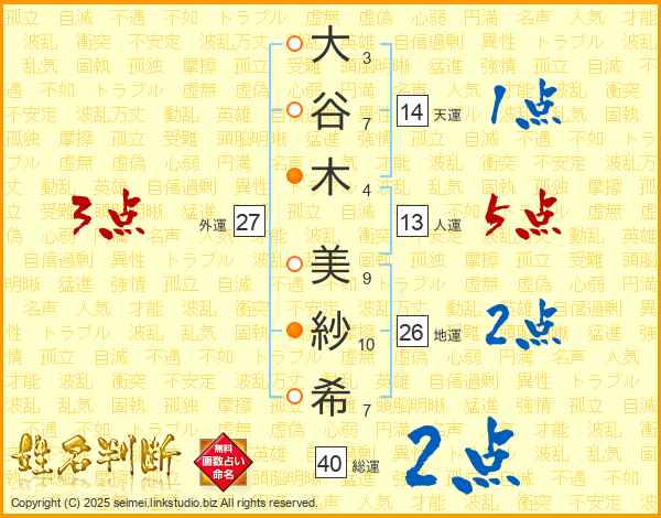 大(3画)谷(7画)木(4画) 美(9画)紗(10画)希(7画)