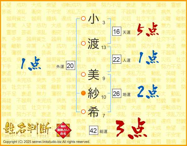 小(3画)渡(13画) 美(9画)紗(10画)希(7画)