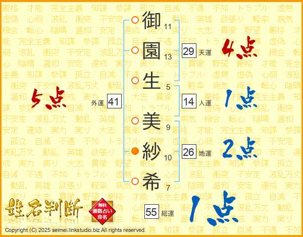 御(11画)園(13画)生(5画) 美(9画)紗(10画)希(7画)