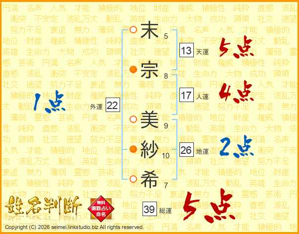 末(5画)宗(8画) 美(9画)紗(10画)希(7画)