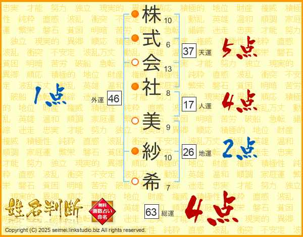 株(10画)式(6画)会(13画)社(8画) 美(9画)紗(10画)希(7画)
