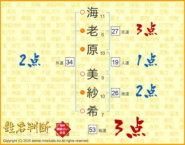 海(11画)老(6画)原(10画) 美(9画)紗(10画)希(7画)