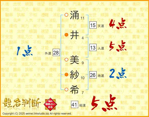 涌(11画)井(4画) 美(9画)紗(10画)希(7画)