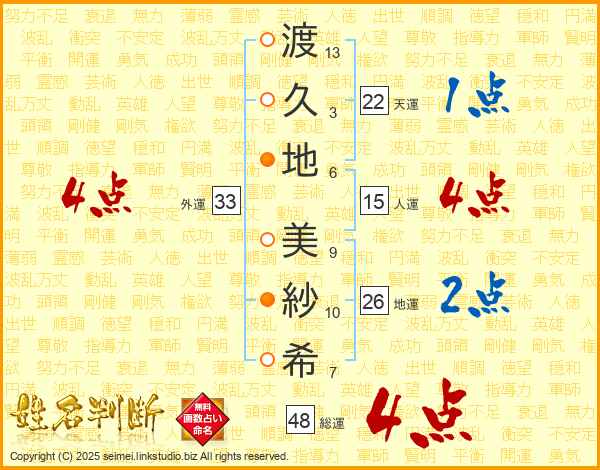 渡(13画)久(3画)地(6画) 美(9画)紗(10画)希(7画)