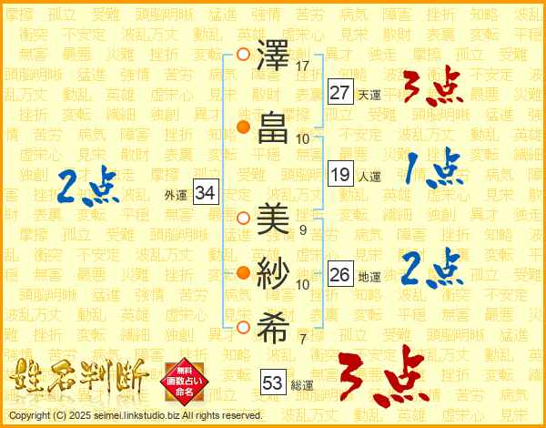 澤(17画)畠(10画) 美(9画)紗(10画)希(7画)