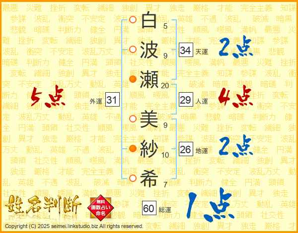 白(5画)波(9画)瀬(20画) 美(9画)紗(10画)希(7画)