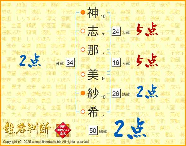 神(10画)志(7画)那(7画) 美(9画)紗(10画)希(7画)