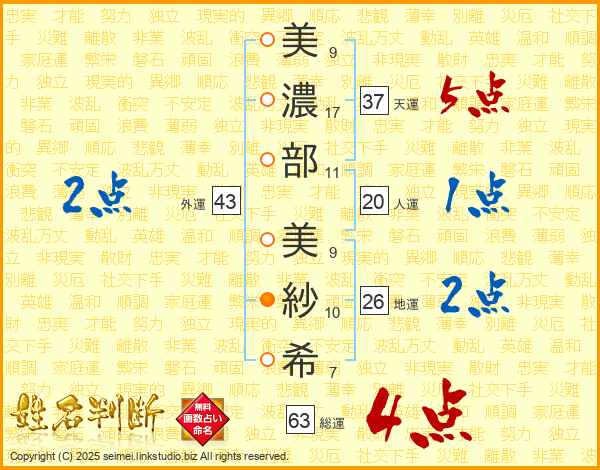 美(9画)濃(17画)部(11画) 美(9画)紗(10画)希(7画)